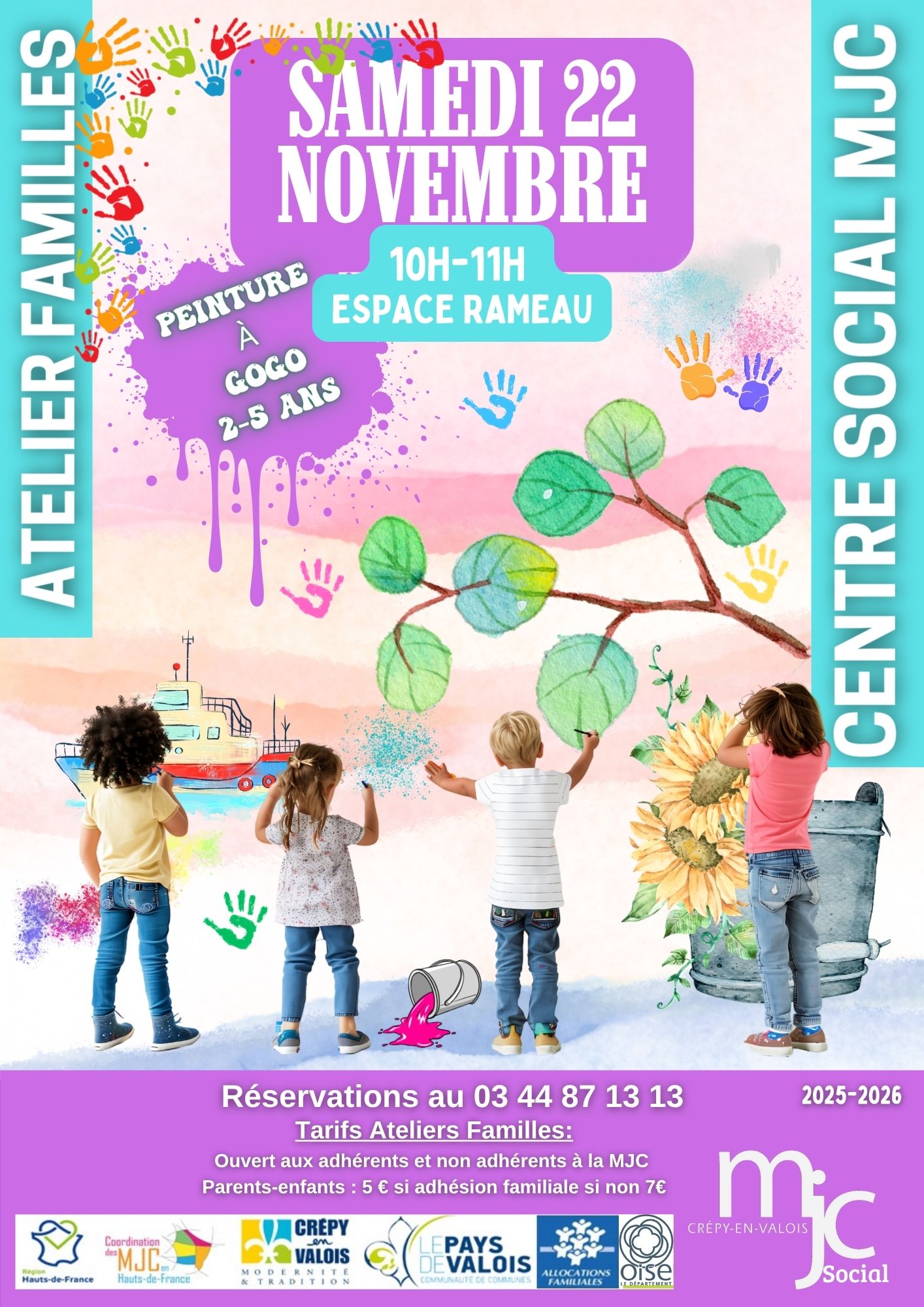 Avis aux artistes de 2 à 5 ans et à leurs parents ! Venez découvrir la peinture sous toutes ses formes lors d’un atelier plein de couleurs et de bonne humeur, samedi 22 novembre 2025 de 10h à 12h à la mjc centre social.