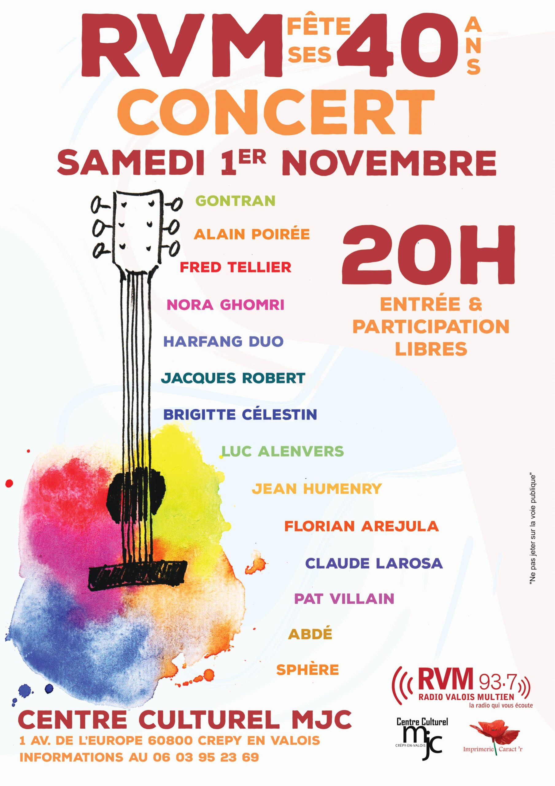 Samedi 1er novembre 2025 à 20h, ne manquez pas le concert événement des 40 ans de Radio Valois Multien où plus de 10 artistes locaux viendront soutenir la radio locale et partageront leur répertoire sur scène.