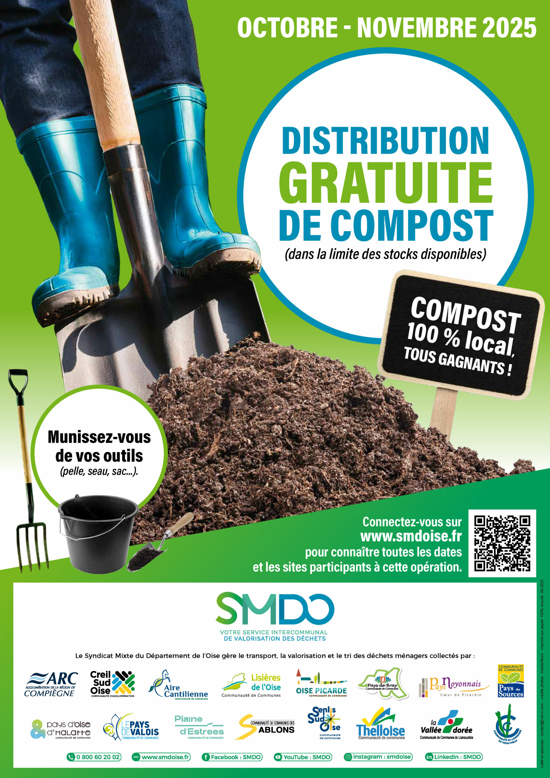 Le SMDO organise une distribution gratuite de compost 100% local, samedi 18 octobre 2025 de 9h à 15h sur le parking de la Passerelle.