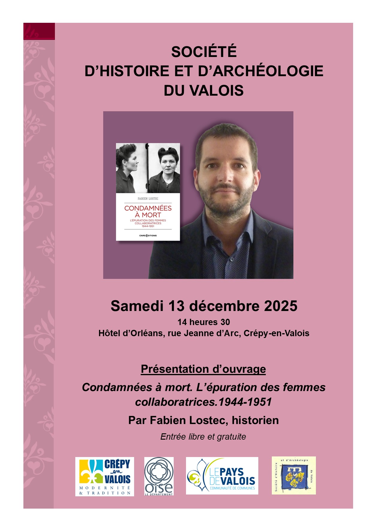 La SHAV propose le samedi 13 décembre à partir de 14h30 une rencontre avec l’historien Fabien Lostec. Auteur du très remarqué Condamnées à mort. L’épuration des femmes collaboratrices (1944-1951), Fabien Lostec est docteur en histoire contemporaine et chercheur à l’Université de Rennes. Il était déjà venu à Crépy-en-Valois dans le cadre des conférences de la SHAV en juin 2015. Nous sommes donc ravis de le retrouver pour la présentation de son livre qui a obtenu le Prix Valérien 2024 dans la catégorie « Enquête »
