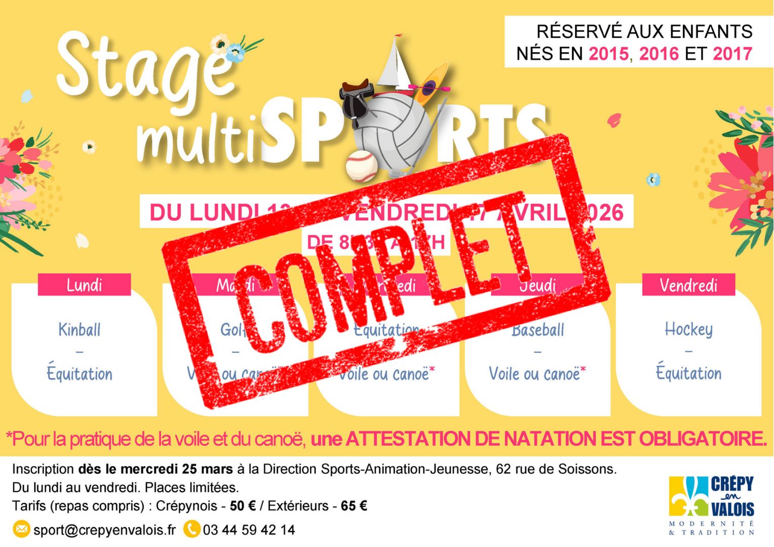 Pendant les vacances de printemps, du lundi 13 au vendredi 17 avril 2026 de 8h30 à 17h, la direction Sports-Animation-Jeunesse de la Ville organise un stage multisports pour les enfants nés en 2015, 2016 et 2017. L’objectif est d’initier les enfants à la pratique de plusieurs sports.