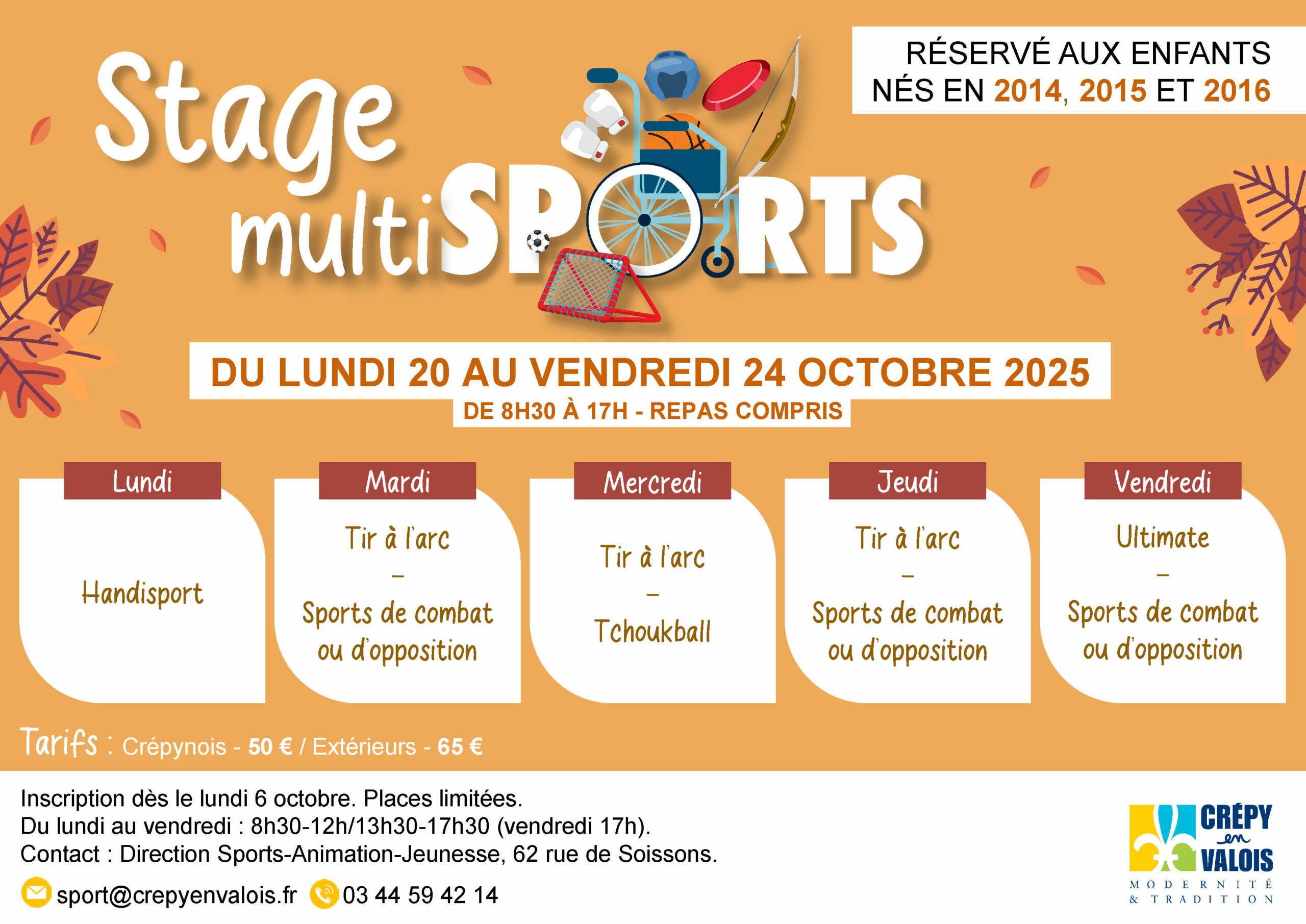 Pendant les vacances de la Toussaint, du lundi 20 au vendredi 24 octobre 2025, la direction Sports-Animation-Jeunesse de la Ville organise un stage multisports pour les enfants nés en 2014, 2015 et 2016. L’objectif est d’initier les enfants à la pratique de plusieurs sports.