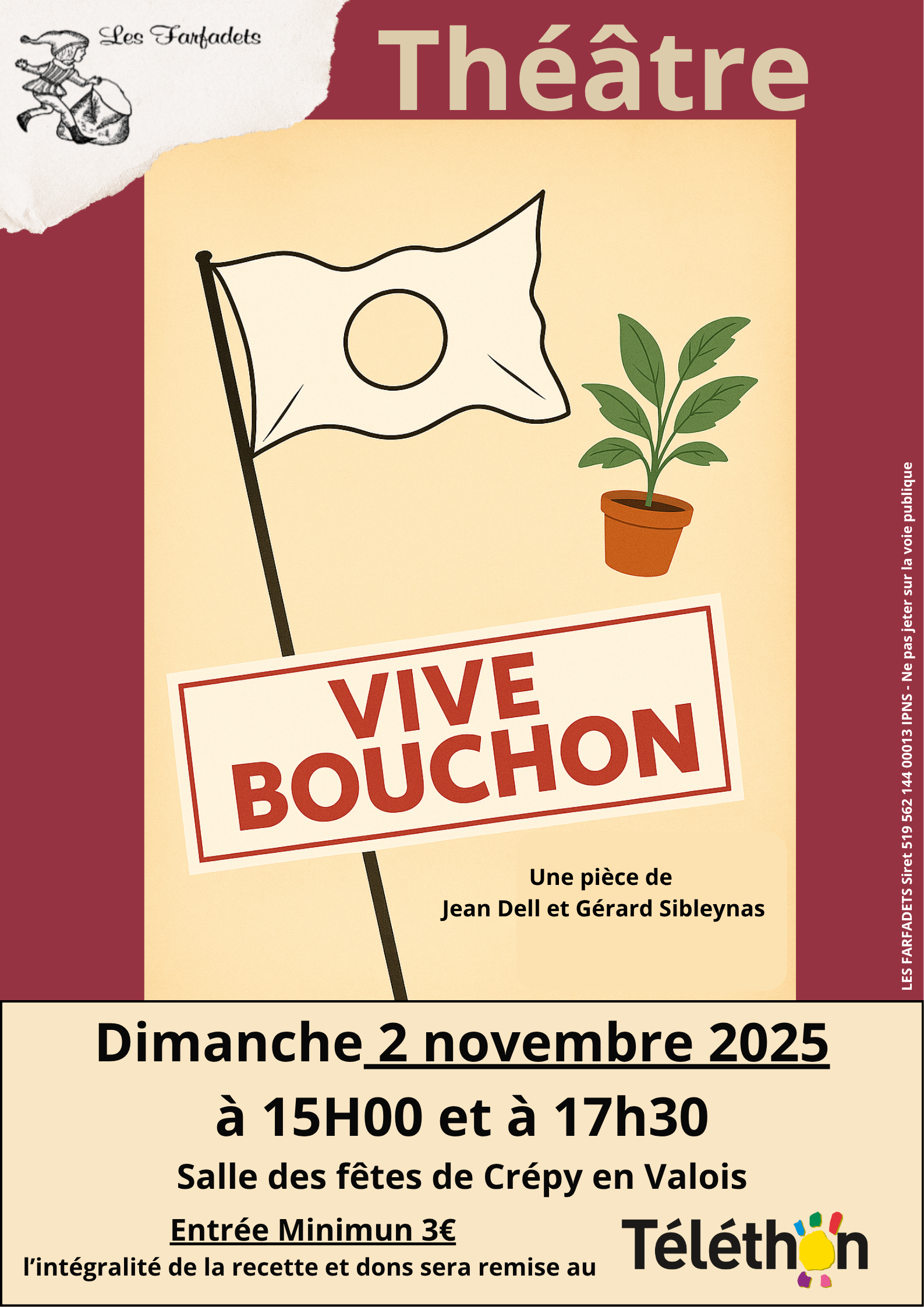 La troupe théâtrale crépynoise vous donne rendez-vous dimanche 2 novembre 2025 à la salle des fêtes pour découvrir « Vive Bouchon », une pièce de Jean Dell et Gérard Sibleynas, au profit du Téléthon.